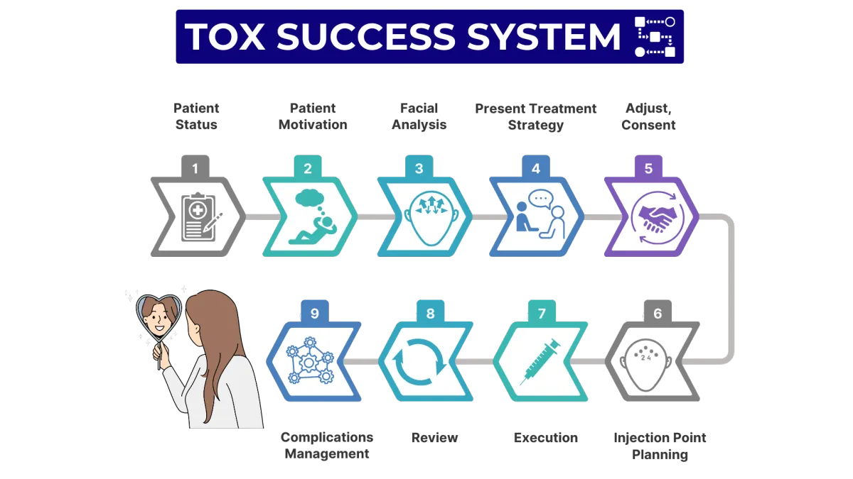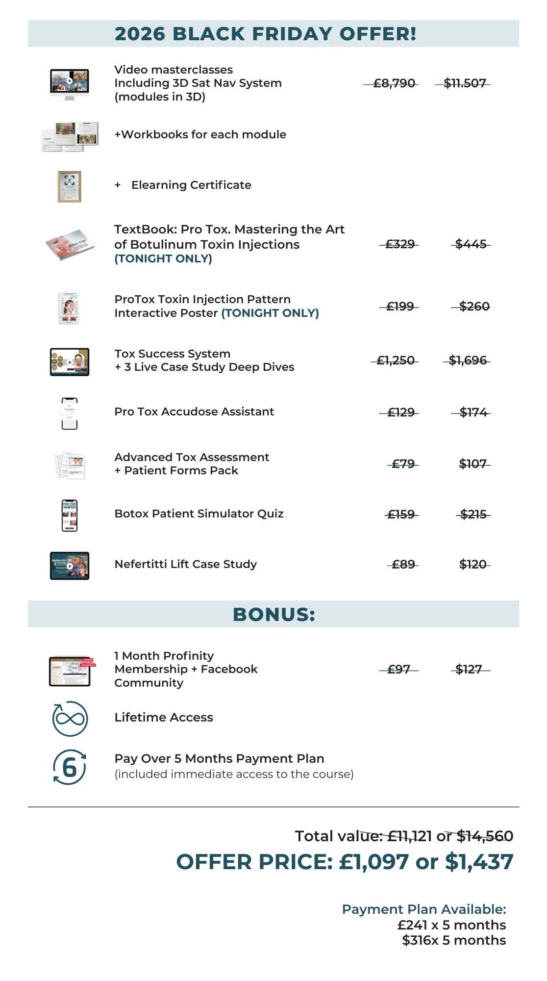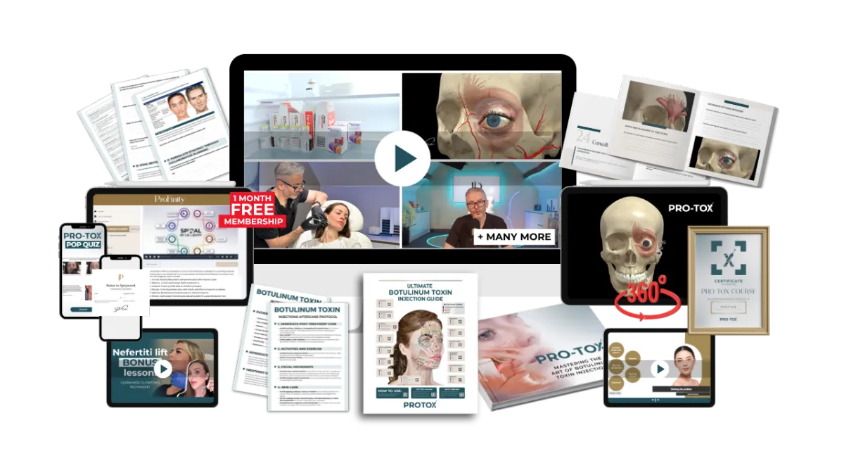 Pro Tox is the first and only course to offer a comprehensive, end-to-end system for mastering botulinum toxin treatments. Our unique approach covers everything from the fundamentals of toxin pharmacology to advanced injection techniques, patient consultation strategies, and complication management. Plus, with our exclusive Tox Success System and Advanced Botulinum Toxin Consultation Form, you'll have the tools you need to achieve exceptional patient satisfaction and practice growth.